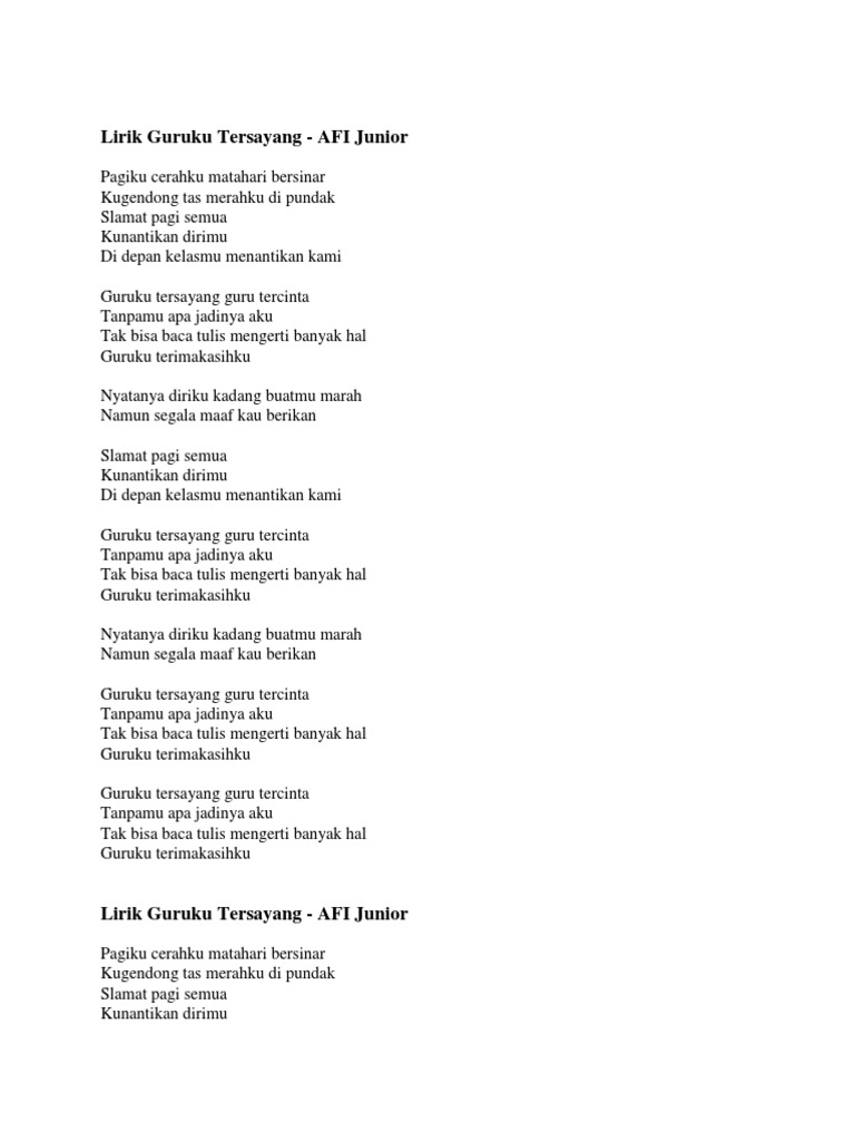 Lirik lagu guruku tersayang afi junior. Sebagai seorang murid yang berbakti pada guru kita harus tahu lirik lagu Terima Kasih Guruku. Not angka lagu afi junior terima kasih guruku inneke koesherawati hot film jadul 3gp critical thinking moore and parker 9th edition answersrar. Lirik Lagu Terima Kasih Guruku - AFI Junior Pagiku cerahku matahari bersinar ku gendong tas merahku di pundak Slamat pagi semua ku nantikan dirimu di depan kelasku menantikan kami.