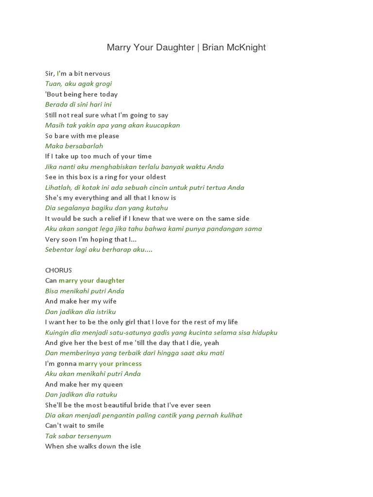 Chords ratings diagrams and lyrics. Im gonna marry your daughter Aku akan menikahi anak perempuanmu Make her my wife Menjadikannya istriku I want her to be the only girl that I love for the rest of my life Aku ingin dia menjadi satu-satunya wanita yang kucinta dalam sisa hidupku And give her. Berikut ini yang mungkin masih berkaitan dengan.